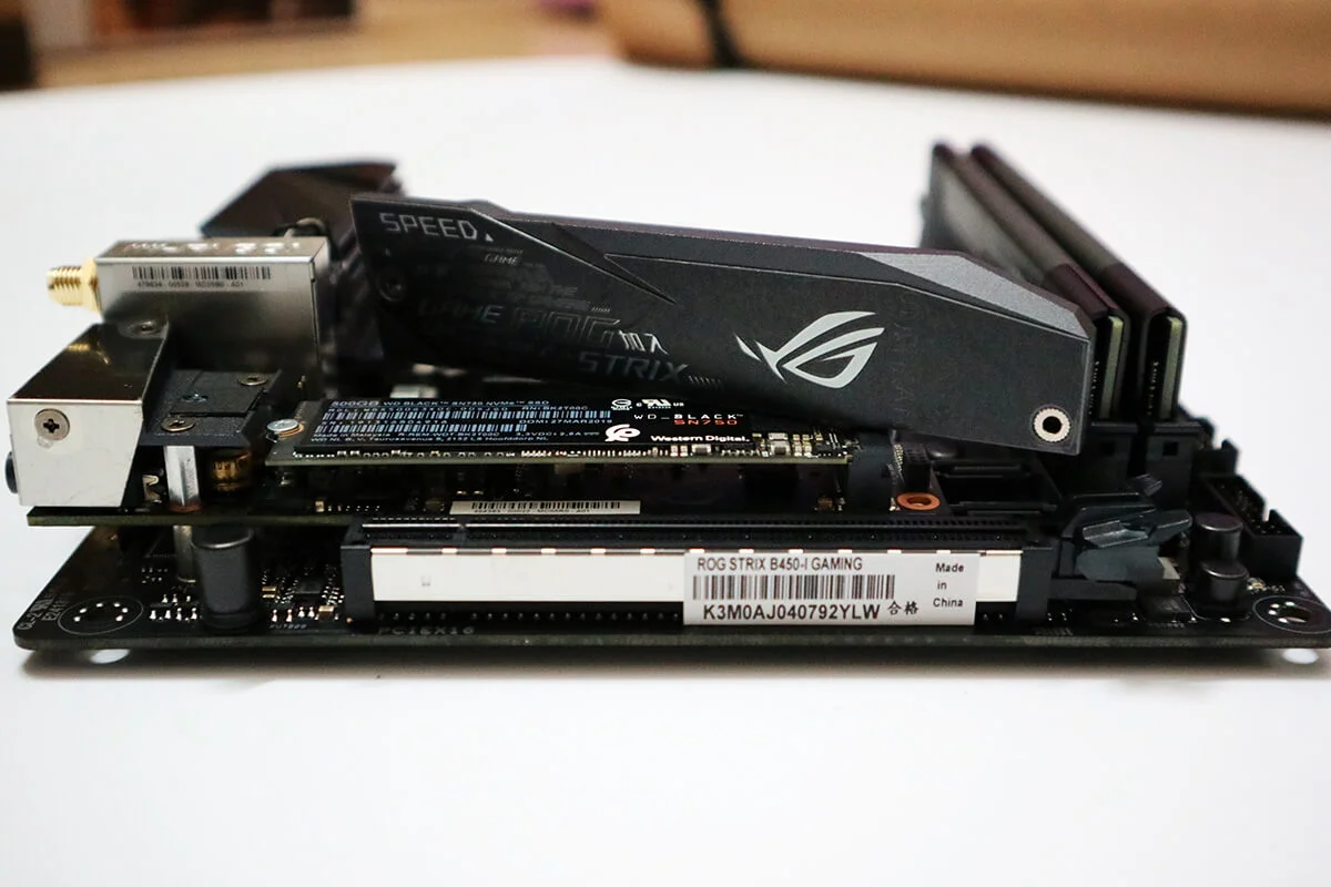 板 U 套选了华硕的 ROG B450-I 小板。B450 芯片组 ITX 小板的可选择余地真的不多,而且小板价格普遍都贵。最初选的是比较多人推的微星 B450I GAMING PLUS AC,优势是同价位最强供电组。后面看到华硕这块板搭载了 2 个 M.2 插槽,除了常规的主板背部一个外,板前面还有一个,而且前面这个有散热马甲(就是下图主板中“败家之眼”那个位置)!