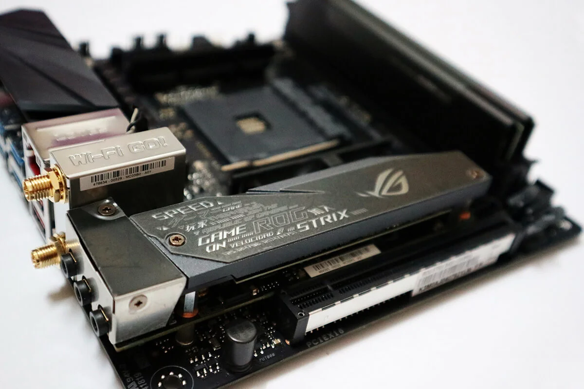 第一次用上 NVMe 的盘,真的很小巧一个。要将 NVMe 固态安装到华硕这块 B450I 板前面的 M.2 插槽上需要先取下主板的散热马甲。