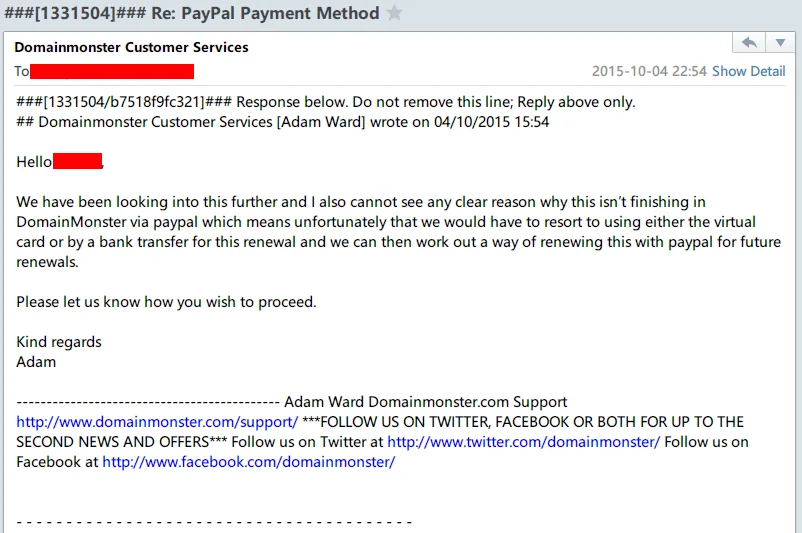 回到域名怪兽家,既然不能续多年,那问问还有没有其他支付手段吧,尽量避免用全球付。跟客服来来回回十几封邮件,最终被告知除了网站标出的方式,最多只能用银行转帐(bank transfer)方式付款,还要等数天确认。期间还被建议先往 Paypal 里充值再下单,天知道在天朝不能充值 PP。(无奈脸