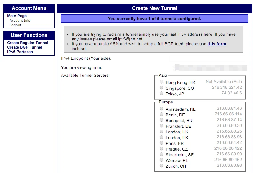 支持 IPv6 以及 6in4 的 Openwrt 路由器是前提了。到 https://tunnelbroker.net/ 注册一个新帐号。登录后,点击左侧的 User Functions 中的 Create Regular Tunnel 创建新的隧道。