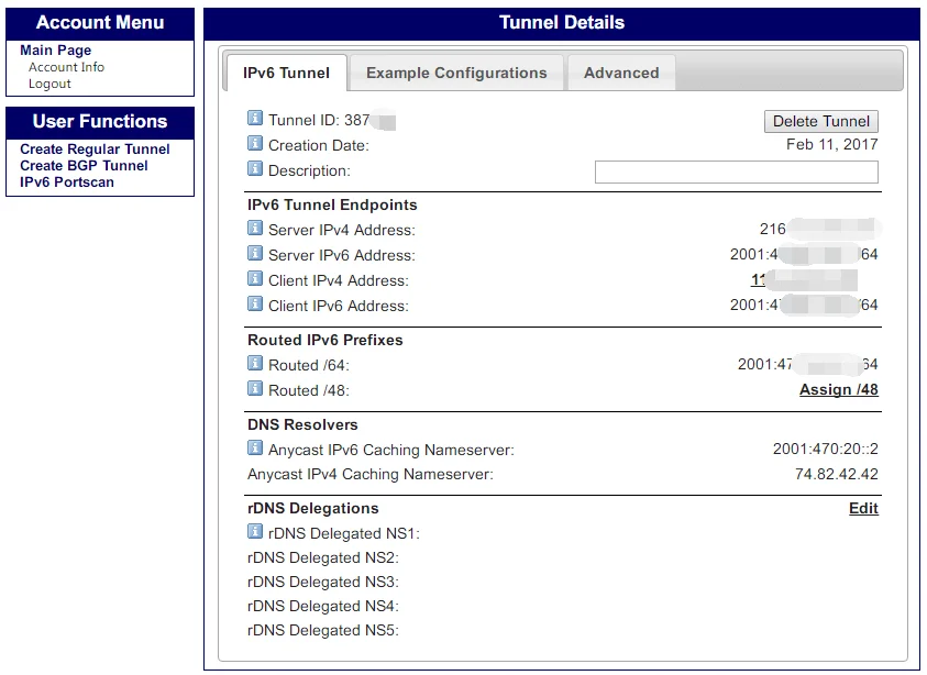 其中 IPv6 Tunnel Endpoints 部分是这个 6in4 隧道两端的 IPv4 和 IPv6 地址。Server 是 HE 的隧道服务器,Client 是我们的路由器或计算机。下方的 Routed IPv6 Prefixes 是该隧道可用于分配的 IPv6 地址段,可为路由器背后的内网机器都分配上唯一的 IPv6 地址。