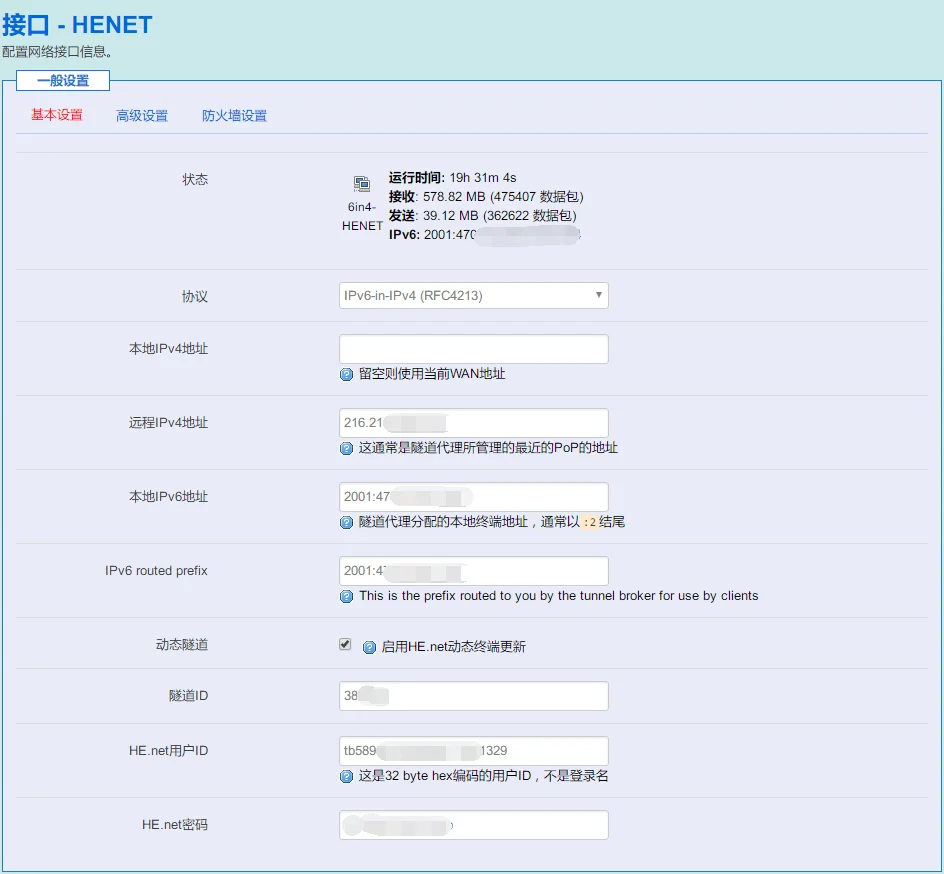 接着“基本配置”。“本地IPv4地址”留空,“远程IPv4地址”填写上面创建的 HE 6in4 隧道中的“Server IPv4 Address”,“本地IPv6地址”填写隧道中的“Client IPv6 Address”,“IPv6 routed prefix”填写隧道中的“Routed /64”。