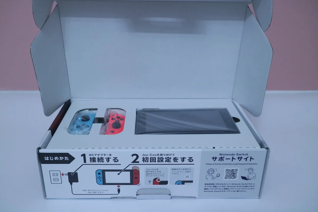 打开上盖后,盒内正前方还有醒目的说明提示,有点意思。第一层就是两个有多种使用方法的 Joy-Con 手柄与掌机本体。