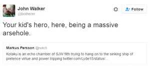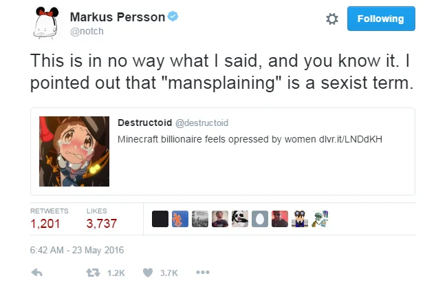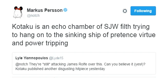 推特上的马库斯·佩尔松一直是多个论战的中心,不仅引起过一大批与他意见不一的人的愤怒,也造成过在游戏媒体中出现过多篇因为他的观点而抨击他的社论。每当他在推特上发表一个观点,一个新的社论似乎就诞生了。这些愤怒被整整齐齐地装进了网络文化大战的弹药当中。